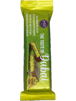 トルコ発〈エリート〉のドバイチョコレートは原産国ならではの本物の素材にこだわり、フィリングにはトルコ産のカダイフとトルコ産のピスタチオを使用。ミルクチョコレートで包まれたそのフィリングは、サクサクでありながらクリーミーでリッチな味わい。